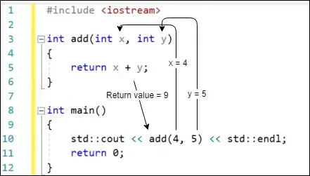 std::cout << add(4, 5) << '\n'; // Arguments 4 and 5 are passed to function add()