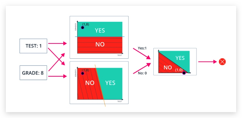 每个感知元决定其自身输入数据的权重并输出数据,将所有数据进行求和,得到最终的决策结果。