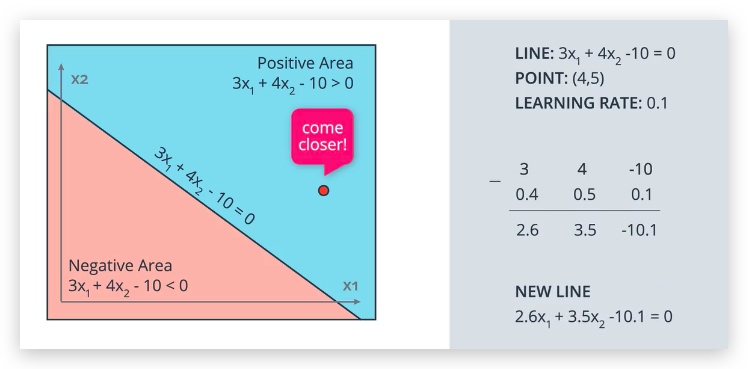 (3-4)x1 + (4-5)x2 - 10 = 0,当x1和x2一定时,显然此时的等式时可以将其归类到正确的结果的,也就是说3x1 + 4x2 - 10 = 0时,x1,x2期望被归类为小于0,那么(3-4)x1 + (4-5)x2 - 10 = 0可以满足。但是一般我们不会这样明显的移动我们的模型, 因此引入学习速率参数,例如0.1,每次只移动一小段距离,即: