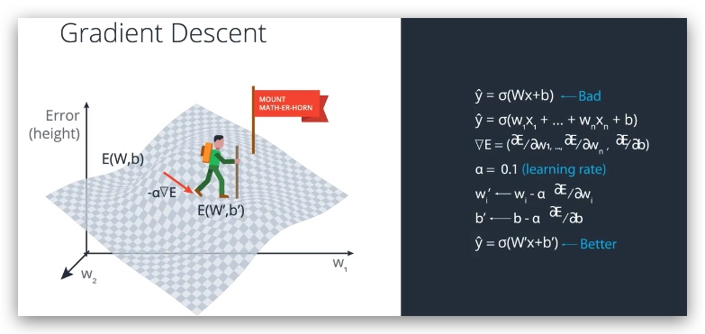误差函数让我们了解如何改进我们的结果,是我们不断尝试缩小的一个目标值,例如我们要到达山底,则山的高度是我们要克服的误差。我们希望不断减少这个误差以达到目标。