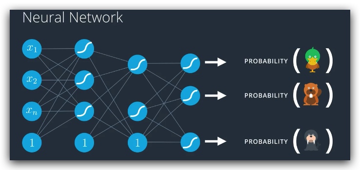 如果输出层有多个节点的话,我们可以计算出每个节点的分数,然后通过Sigmoid函数,我们就可以计算出每种分类的概率。