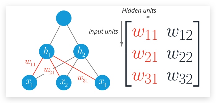 我们可以使用矩阵乘法求得:h1 = x1w11+x2w21+x3w31