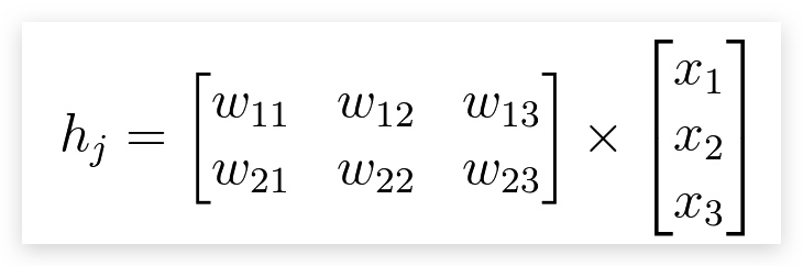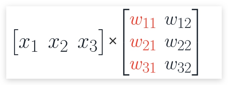 因此,当输入为行向量(x1,x2,x3)时,左乘矩阵W即可得到输出(h1,h2),即:h = xW