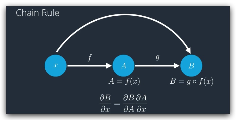 复合函数的导数,就是函数导数的乘积。如图,A=f(x),B = gf(x),那么对B求x的偏导数,实际上相当于B对A求偏导数,乘以 A 对x求偏导数。 因为前向反馈就是多个函数的符合函数,那么做反向传播时,就是算出每一步的导数,然后相乘。
