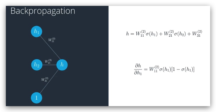 它的符合函数就是矩阵乘以h1带入激活函数sigmoid,那么对h1求偏导数,后面两项都是0,第一项,因为W11(2)是一个常量,那么对h1求偏导数,其结果就是W11(2) 乘以 sigmoid(h1)的导数: sigmoid(h1)(1- sigmoid(h1)),即最终结果如上图所示