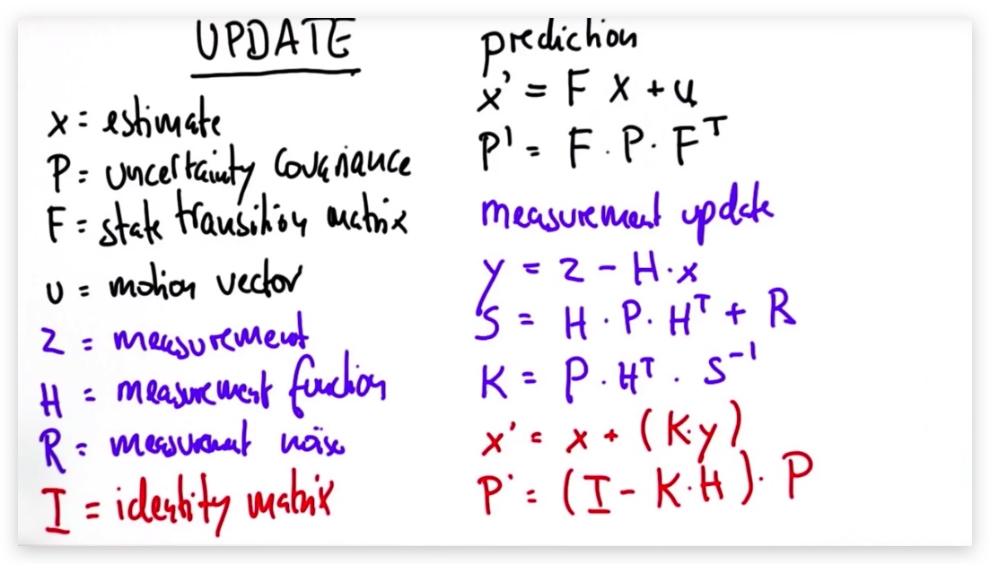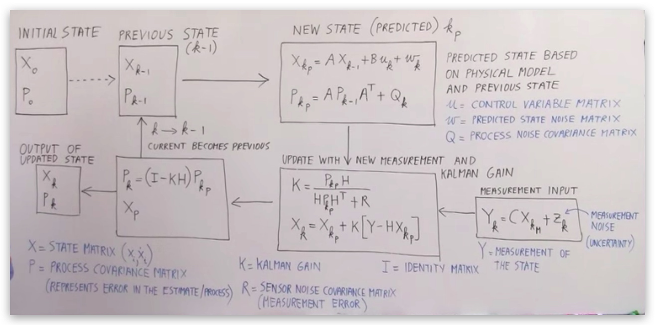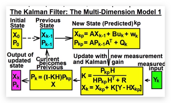 - 前序状态(previous state)中有两个变量Xk-1和Pk-1,我们对其进行预测,得到新状态Xkp和Pkp,用于计算KG