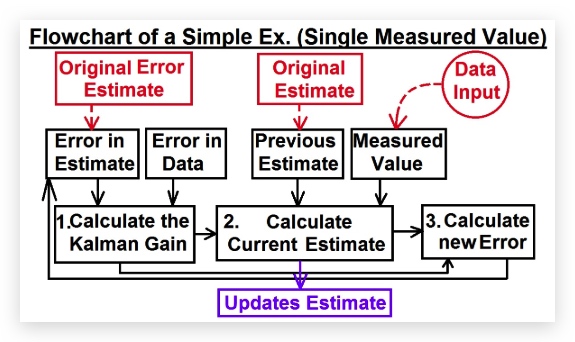- 卡尔曼滤波器的流程如图所示,外部输入用红色表示,其中输入的数据data是不断加入系统的,而初始的估计误差和初始估计值,仅输入一次。