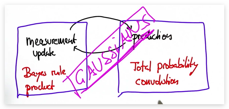 测量的更新,基于乘法法则和贝叶斯定律。 首先我们有一个先验的测量值,然后得到一个新的测量值,两者均为正态分布。使用贝叶斯定律,我们可以得到后验概率,也就是我们更新测量后的结果