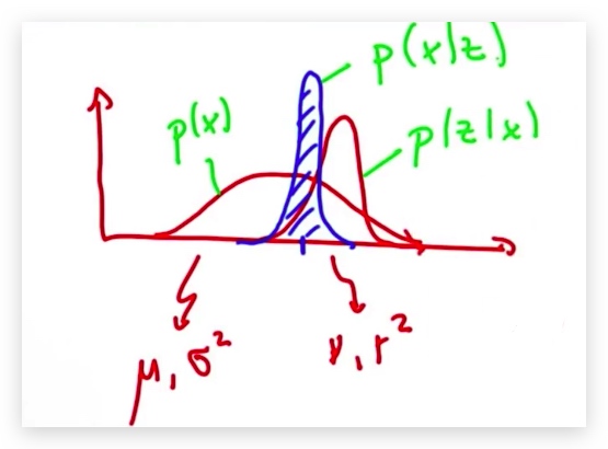 P(X|Z) = P(Z|X)P(X)/P(Z) 叠加之后的正态分布参数为 $ \mu^2=\frac{\mu* r^2 + \gamma*\sigma^2}{r^2+\sigma^2} $