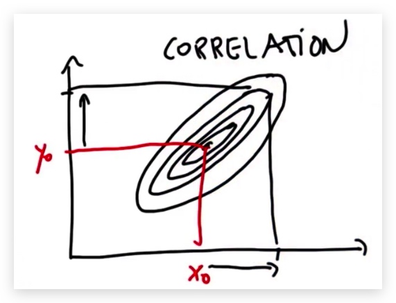 - 如果两个维度相关,则椭圆为斜的,所谓相关,指的是我们可以以一个维度推断另一个维度。通过(X0 ,Y0),则可以推断(X1 ,Y1)