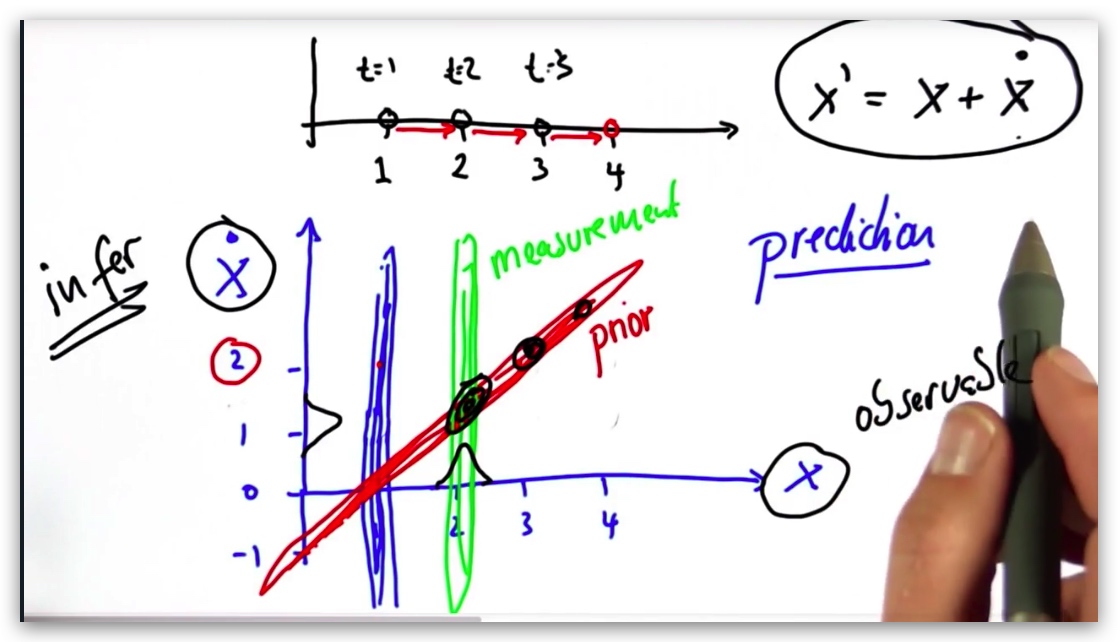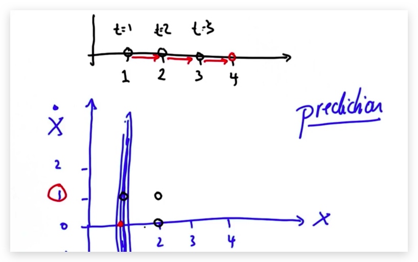 我们可以测量X,不能测量速度,但是速度是位置的导数,所以我们说两个维度是有相关性的。在测量过程中,我们可以测得X,此时我们对速度一无所知。在预测过程中,我们可以假设一个速度,这样就能知道X在此速度下,T+1时的位置X。
